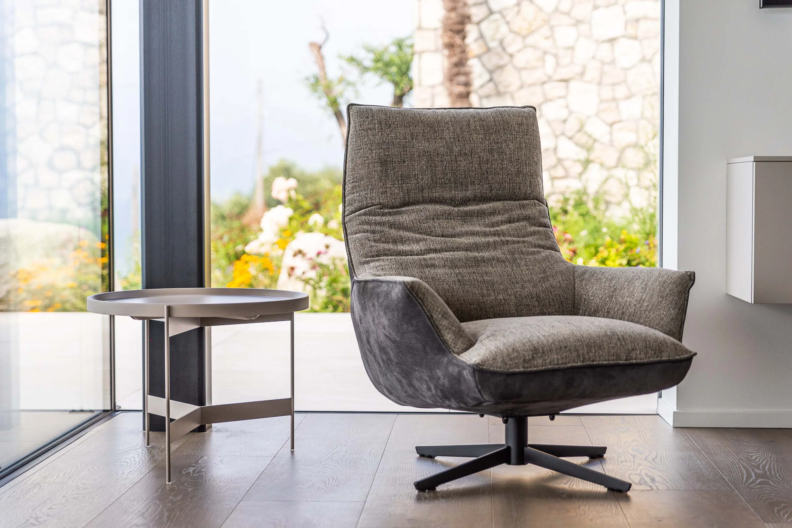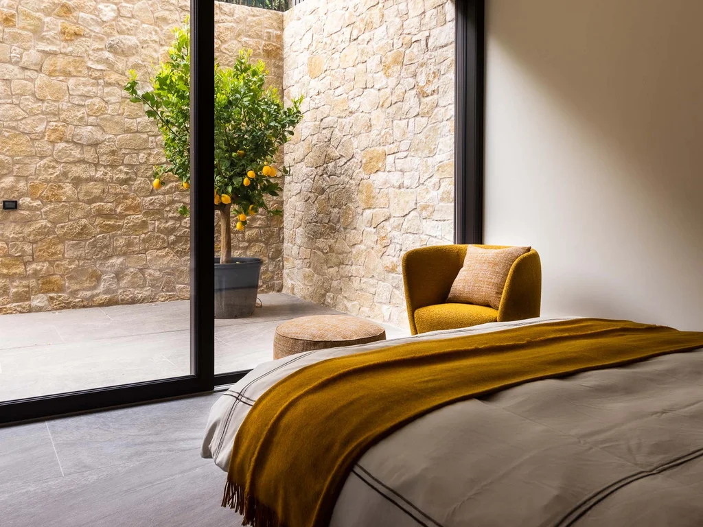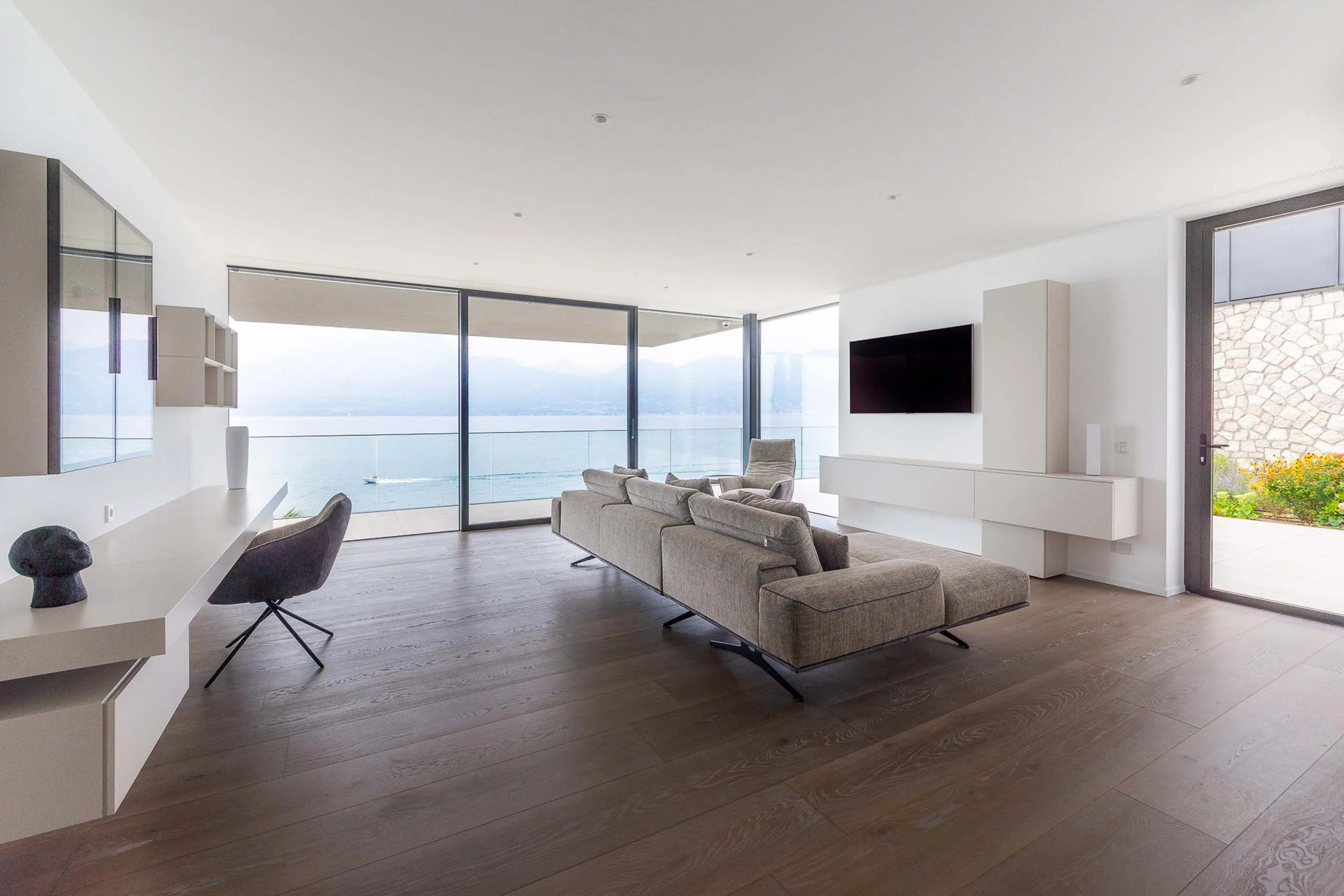 In dieser kleinen, aber feinen Einliegerwohnung wird der Blick auf das Wasser zum Mittelpunkt. Durch die komplett verglaste Fassade bietet jeder Winkel der Wohnung ein fantastisches Panorama auf das malerische Städtchen und den Gardasee. Die Einrichtung ist minimalistisch, aber alles andere als langweilig: Sie bleibt dezent im Hintergrund, ohne auf Komfort zu verzichten. Jeder Sitzplatz ist so ausgerichtet, dass der Blick ungehindert nach draußen schweifen kann. So wird der Raum zum perfekten Rückzugsort.
