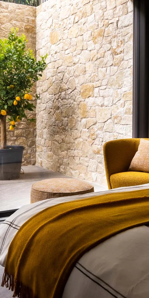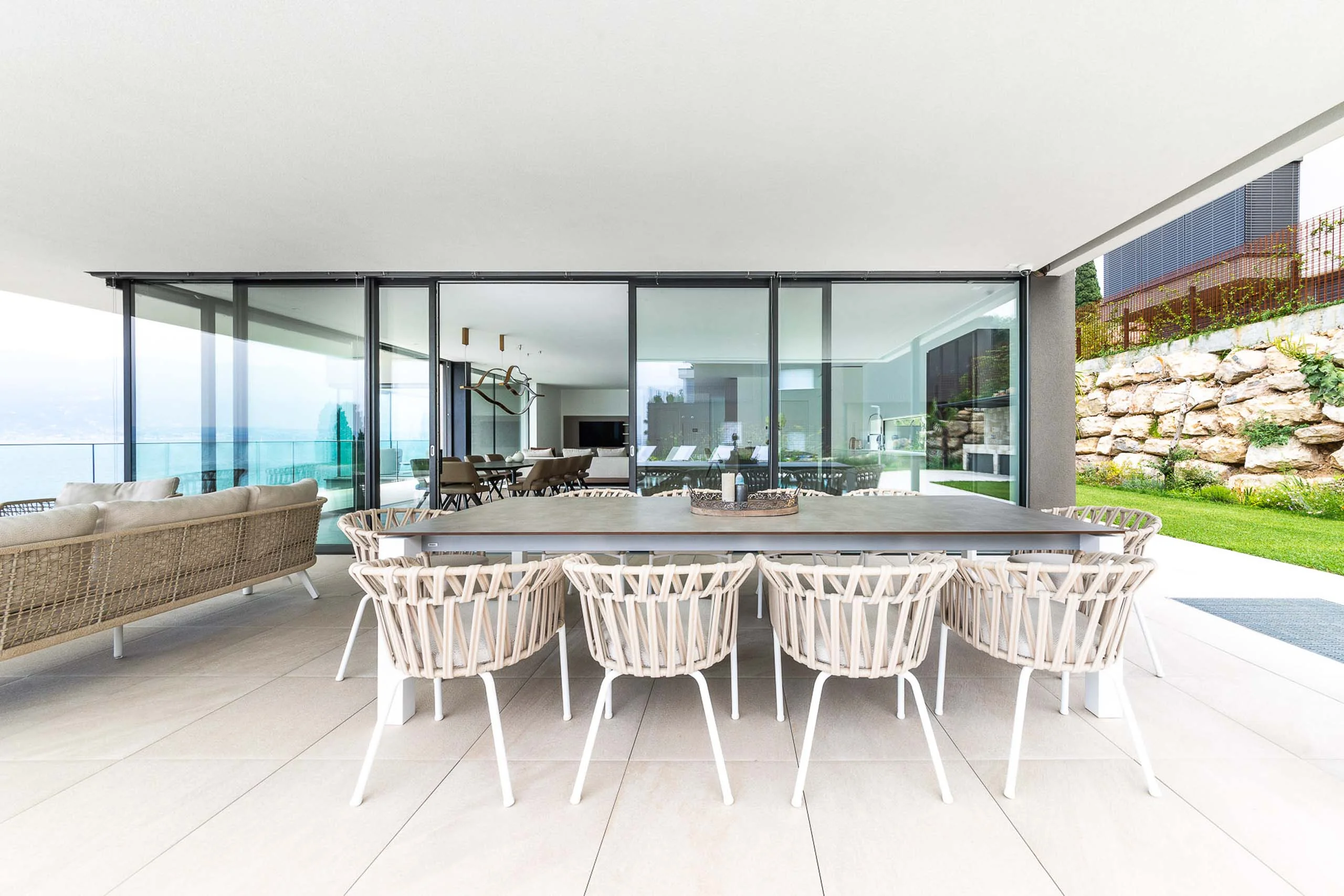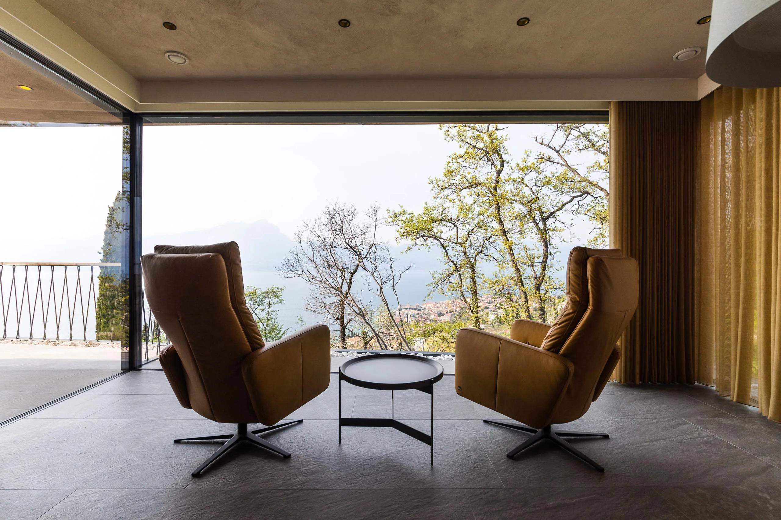 Das Traumhaus am Gardasee fügt sich perfekt in seine Umgebung ein. Das Farbkonzept aus warmen Erdtönen und schlichtem Holz greift die Farben der Natur auf, die durch die großen Fensterflächen nahtlos ins Innere übergeht. Es entsteht eine ruhige, harmonische Atmosphäre. Die Einrichtung ist klar und aufgeräumt – so kommt die Schönheit der Natur rund um das Haus noch besser zur Geltung. Das Lichtkonzept ist ebenso dezent wie durchdacht, mit indirekten Lichtelementen und wenigen, gezielt eingesetzten Leuchten.