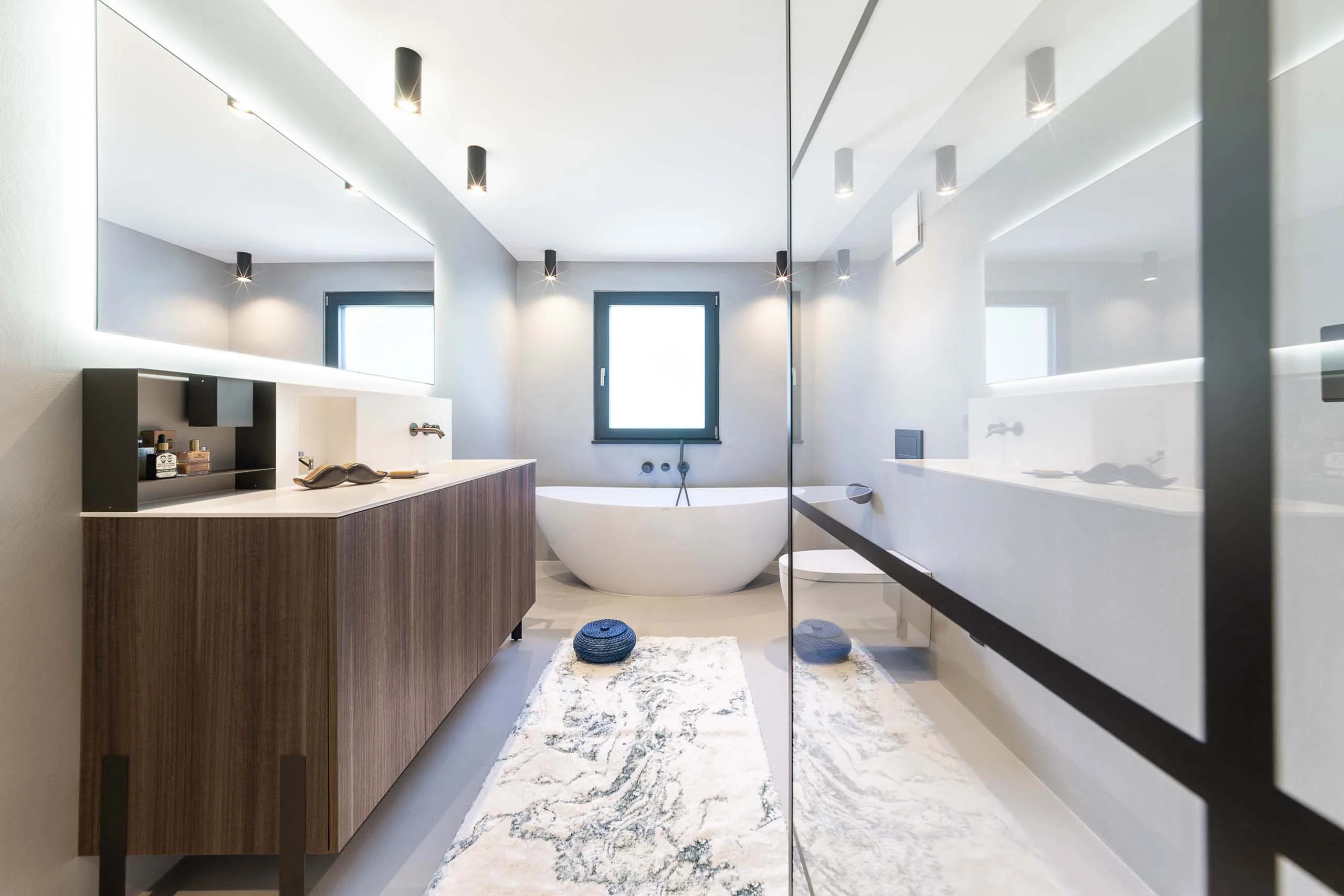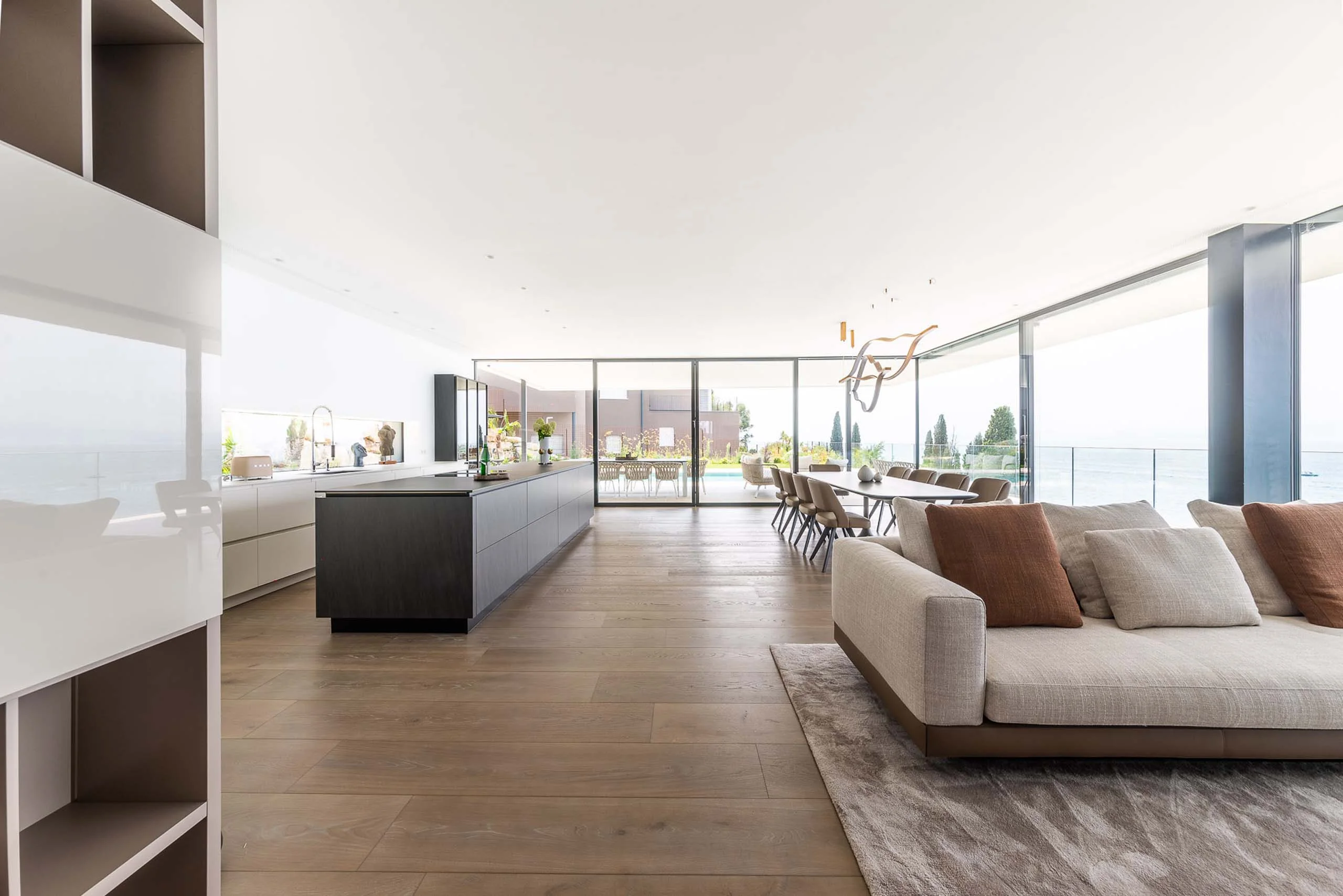 Schon beim Betreten des offenen Wohn- und Essbereichs spürst du diese besondere Atmosphäre. Alles ist hell, weit und luftig – und der Blick ins Grüne und auf den idyllischen See ist einfach magisch. Die Einrichtung ist modern, aber dennoch gemütlich und einladend. Hier merkt man, wie viel Liebe und Detail im Farb- und Materialkonzept steckt: Jedes Element trägt zum harmonischen Gesamtbild bei. Schlicht, aber niemals langweilig – dieser Raum lädt zum Wohlfühlen ein.