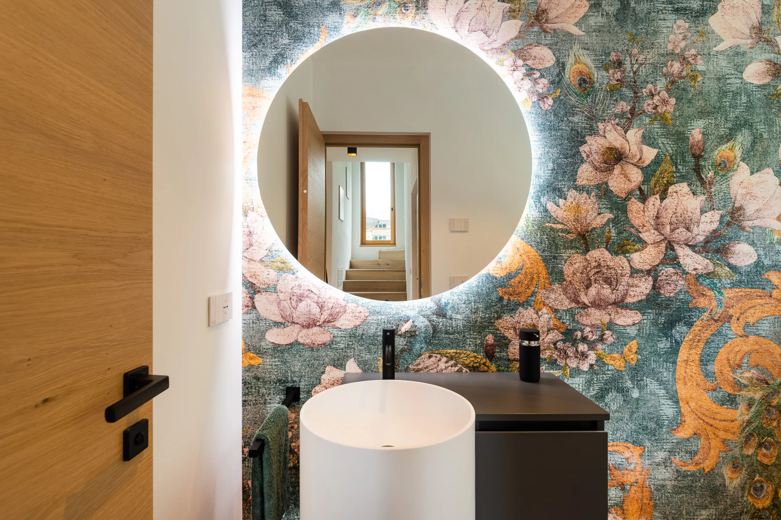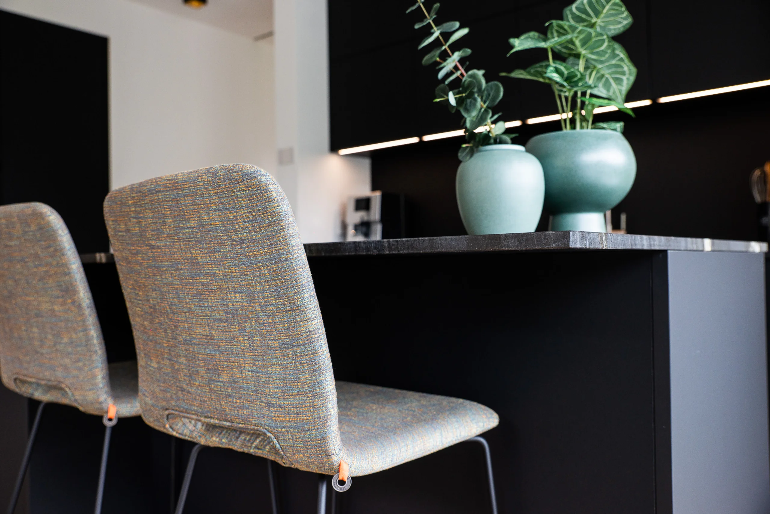 Für unsere Mitarbeiterin Monika durften wir das neue Zuhause in Klausen gestalten – und es ist ein echtes Schmuckstück geworden. Besonders die offene großzügige Küche ist ein Highlight. Wir haben alles genau durchdacht – von der Verbindung aus mattem Schwarz und hellem Eichenholz, die der Küche Eleganz verleiht, bis hin zu praktischen Details wie der pflegeleichten Anti-Fingerprint-Oberfläche und der Induktionskochmulde mit integriertem Abzug. Der Baldachin mit Beleuchtung ist ein absoluter Hingucker und dient gleichzeitig als Ablage. Und die massive Kücheninsel? Sie ist der Mittelpunkt der Küche, der perfekte Ort, um Zeit mit Freunden und Familie zu verbringen. Der eingebaute Weinschrank mit zwei Zonen sorgt dafür, dass die besten Tropfen immer perfekt temperiert sind.