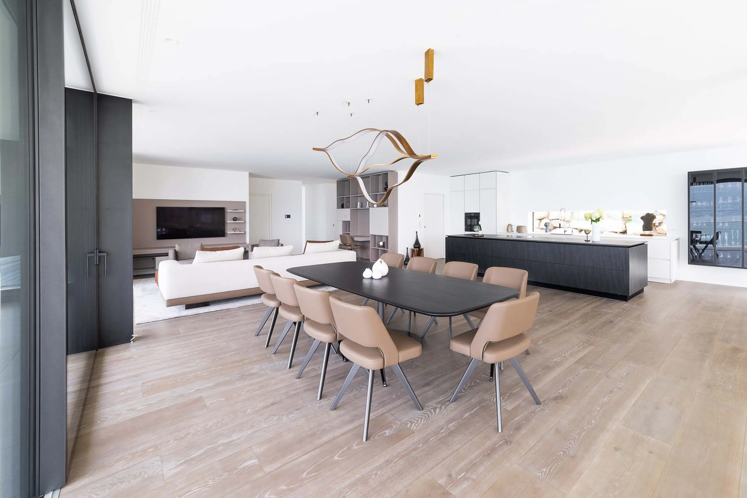 Küche, Wohnzimmer und Schlafzimmer – alles wie aus einem Guss. Die dunkle Eiche kombiniert mit den dezenten Cashmere-Tönen der Lackelemente verleiht dem Raum eine elegante Schlichtheit, die zum Entspannen einlädt. Die frischen Gelb-Akzente bringen Frische ins Zuhause und erinnern an die Zitronenbäume im Garten. Abgerundet wird das Ganze durch ein ausgeklügeltes Lichtkonzept mit dezenten Einbaustrahlern und Designerleuchten.