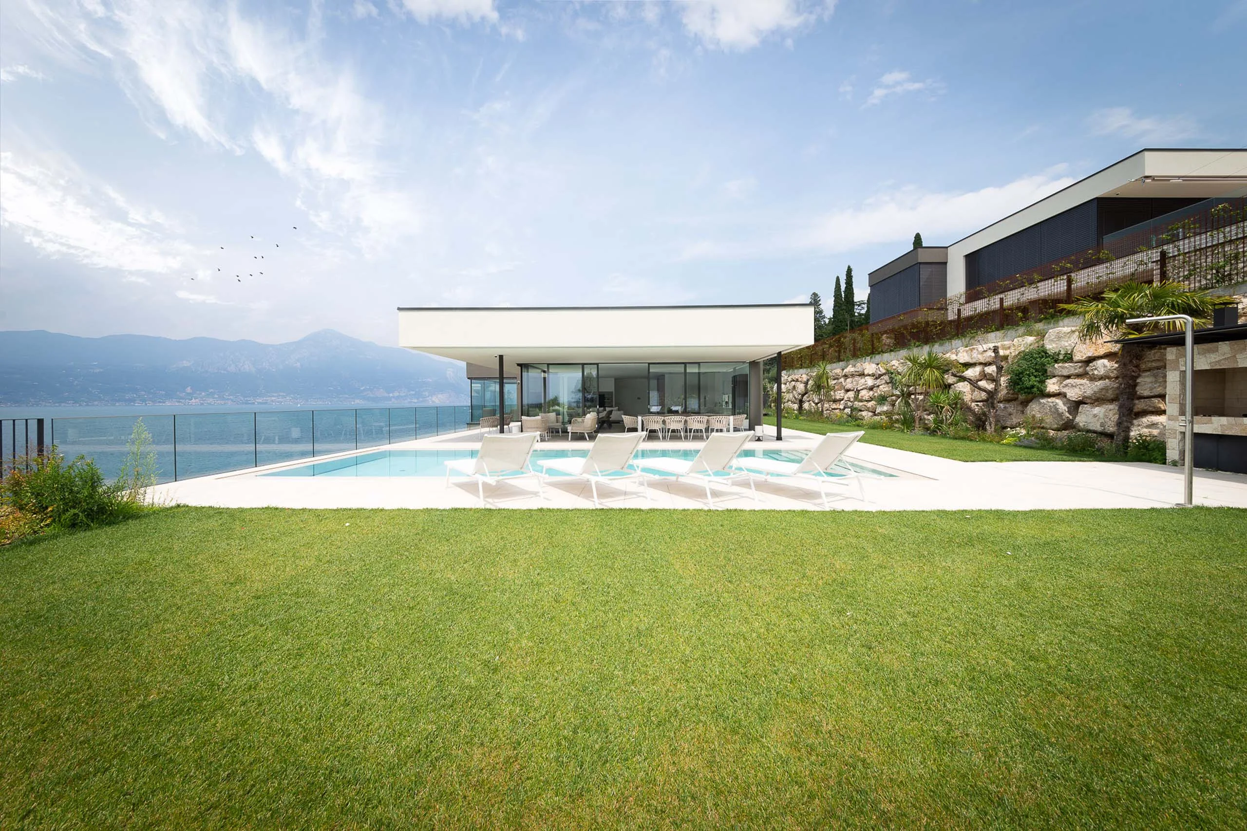 Diese traumhafte Immobilie liegt am südlichen Gardasee, eingebettet in eine wunderschöne Hügellandschaft. Hauptdarsteller ist natürlich der tiefblaue Gardasee, der von jedem Raum aus die Blicke auf sich zieht. Die geradlinige Architektur des Gebäudes und die Farben der umliegenden Natur setzen sich auch im Inneren des Gebäudes fort.