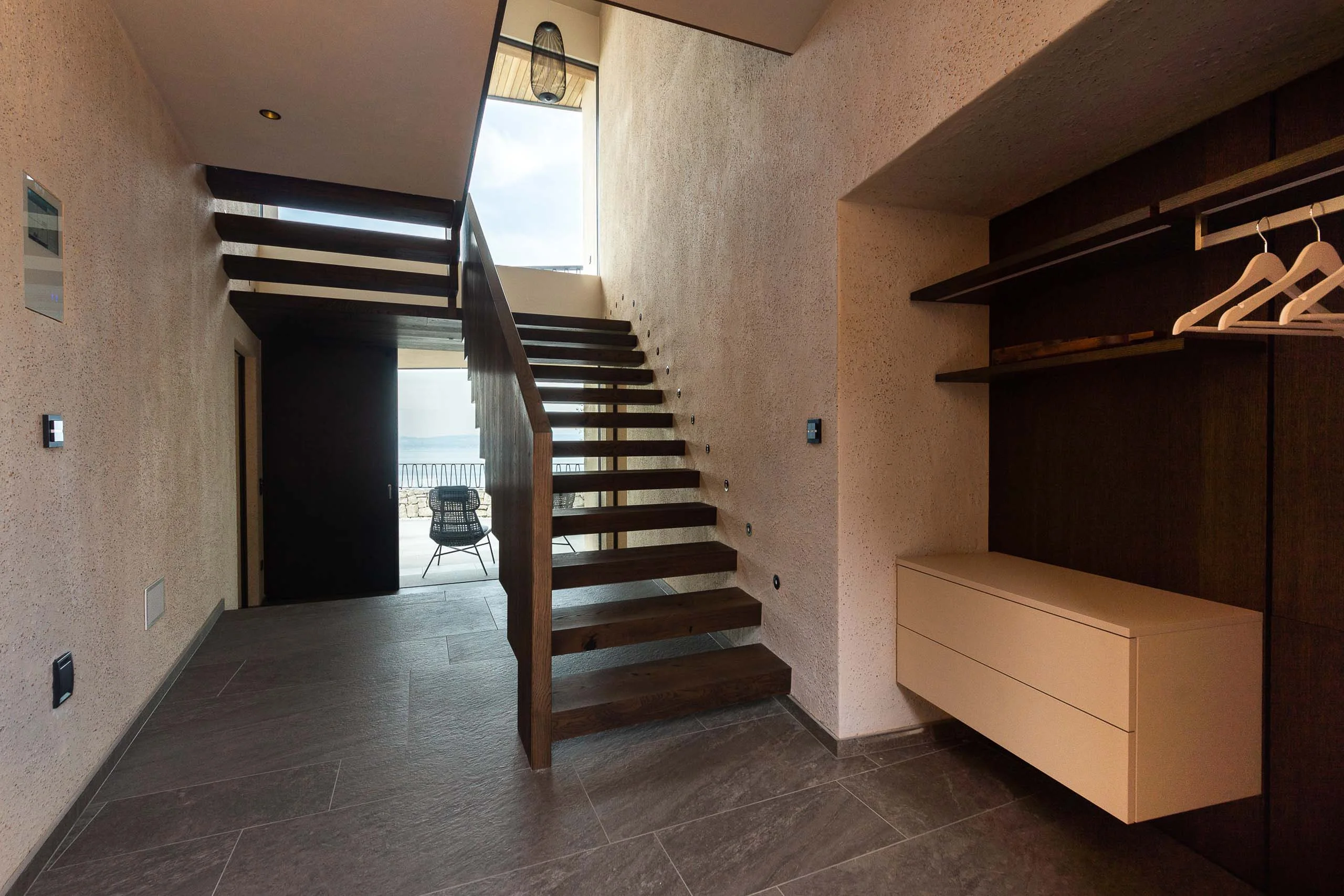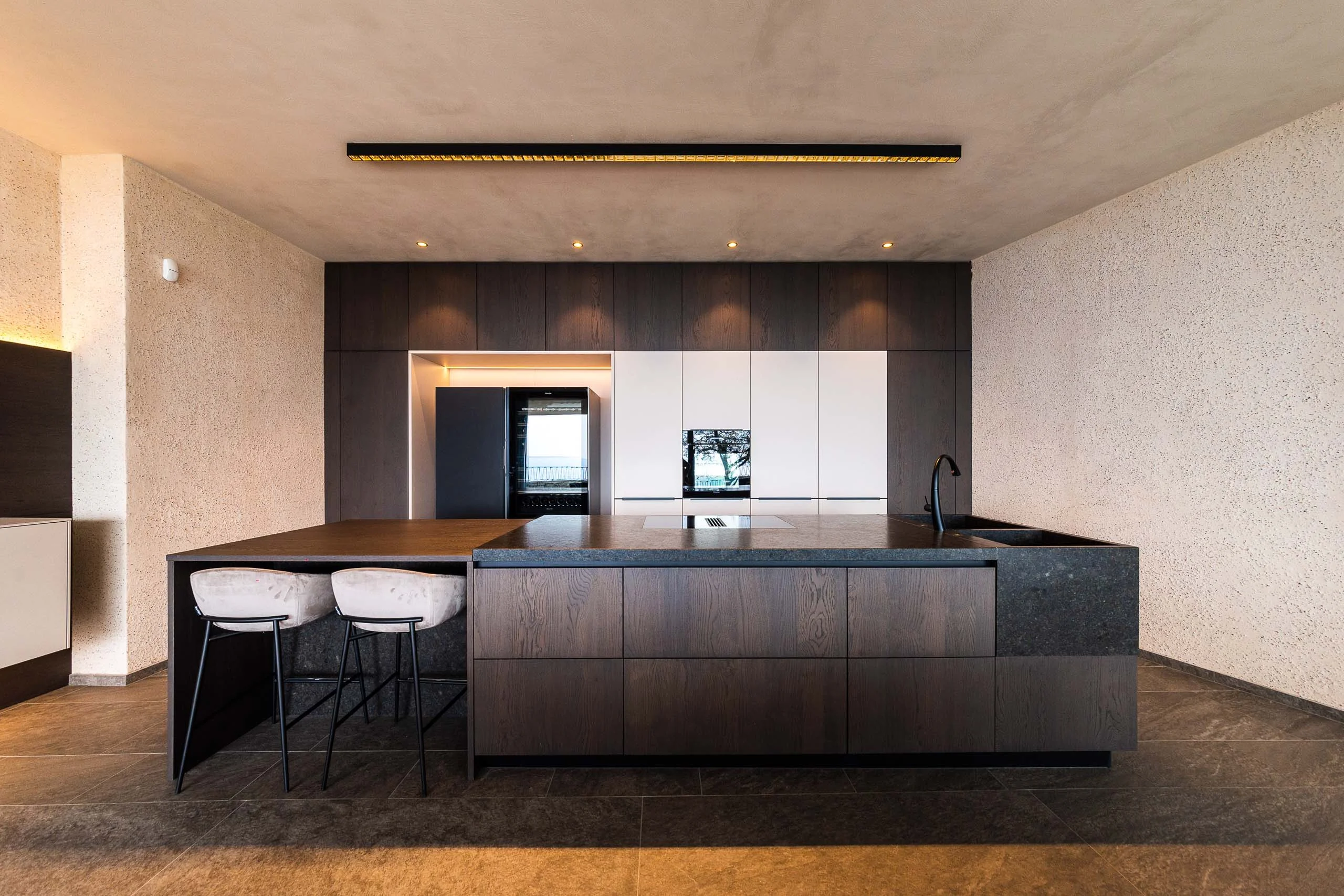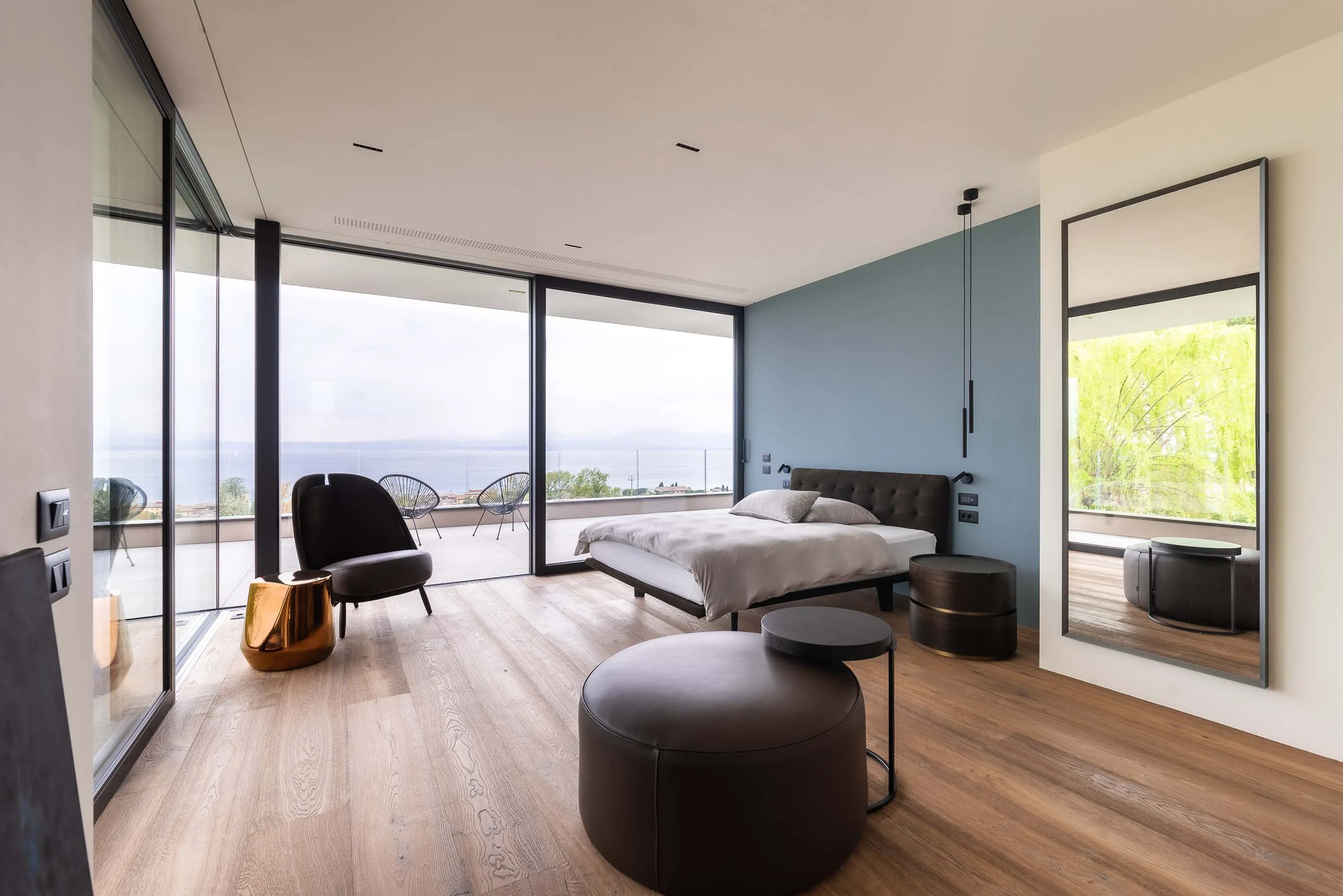 Das Traumhaus am Gardasee fügt sich perfekt in seine Umgebung ein. Das Farbkonzept aus warmen Erdtönen und schlichtem Holz greift die Farben der Natur auf, die durch die großen Fensterflächen nahtlos ins Innere übergeht. Es entsteht eine ruhige, harmonische Atmosphäre. Die Einrichtung ist klar und aufgeräumt – so kommt die Schönheit der Natur rund um das Haus noch besser zur Geltung. Das Lichtkonzept ist ebenso dezent wie durchdacht, mit indirekten Lichtelementen und wenigen, gezielt eingesetzten Leuchten.