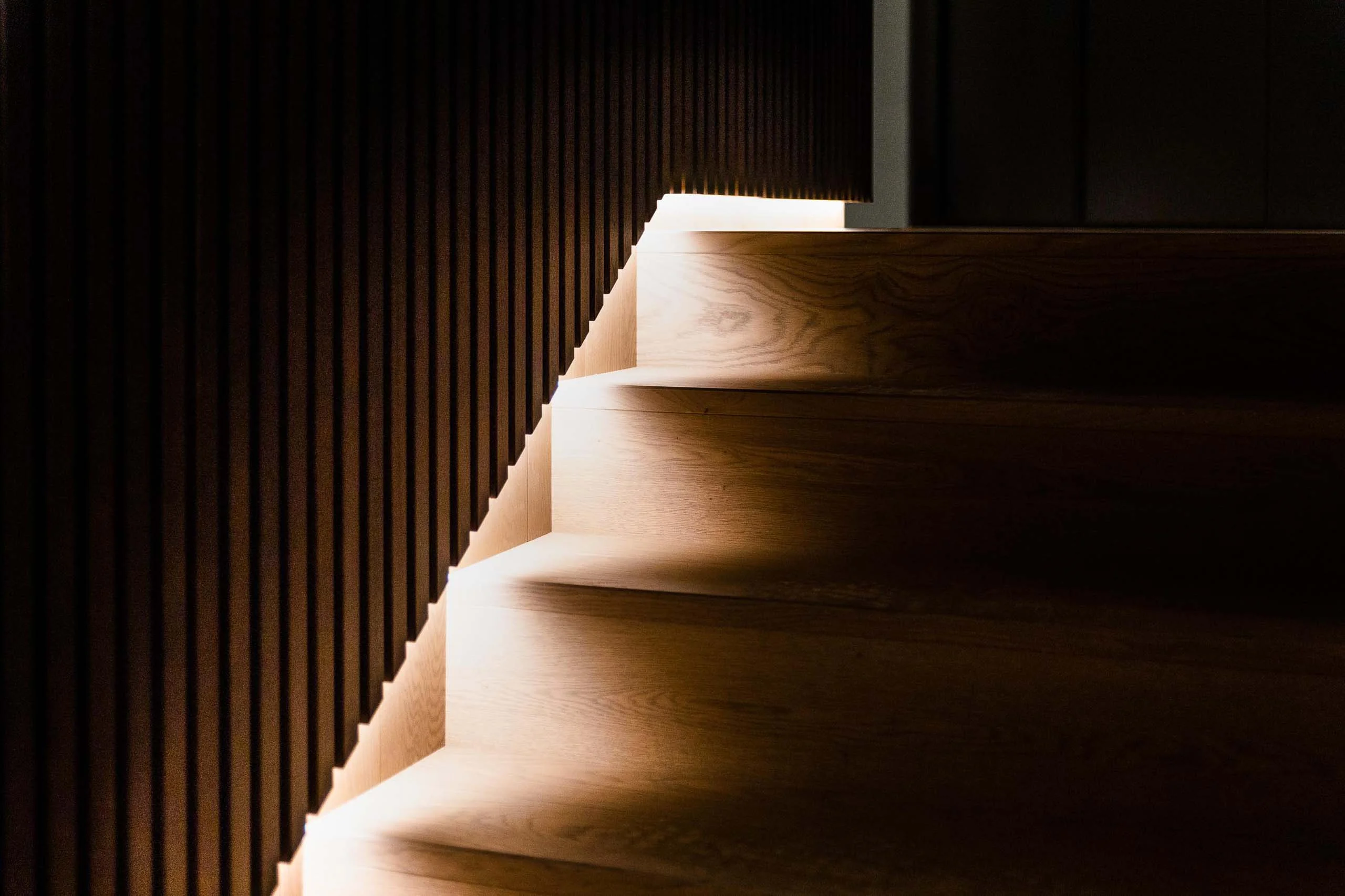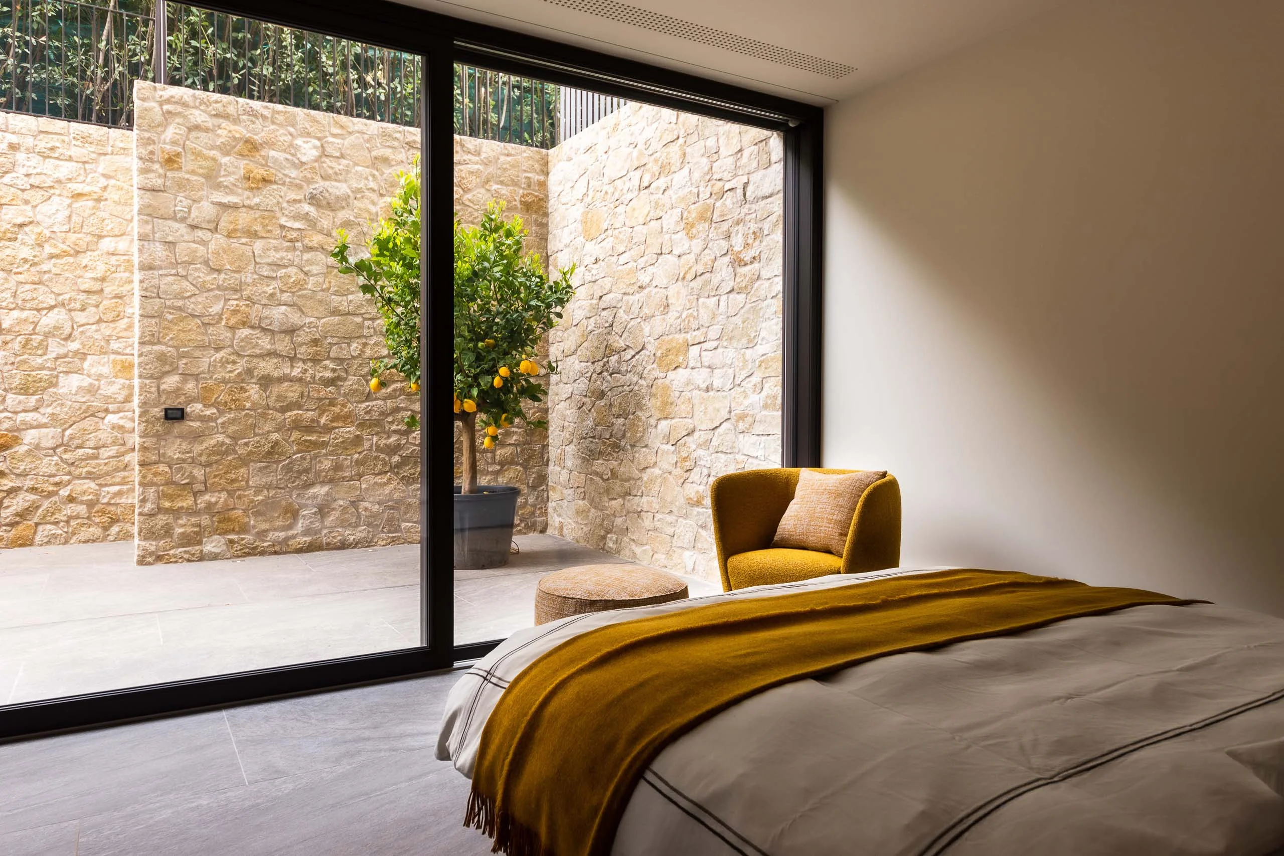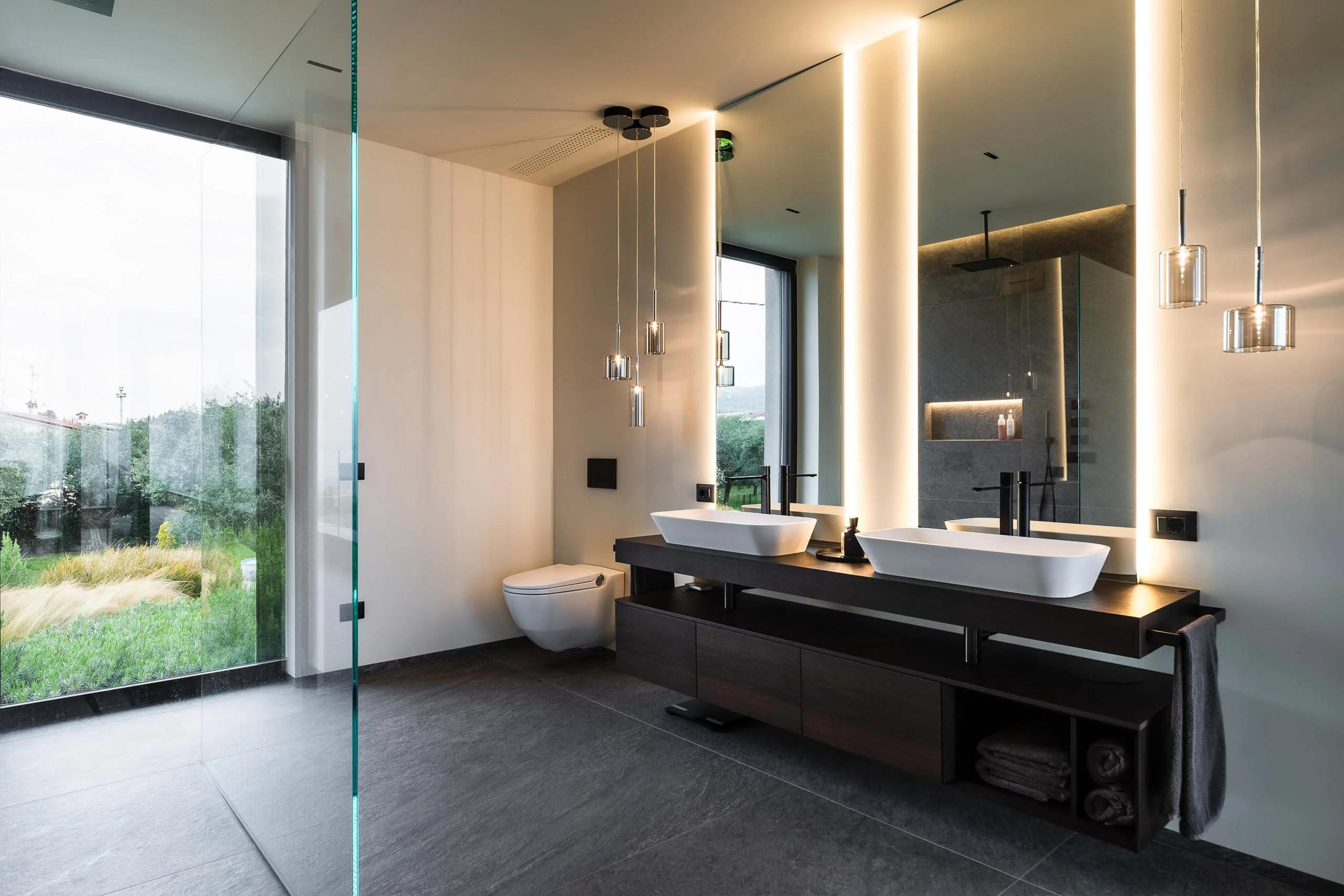 Das Traumhaus am Gardasee fügt sich perfekt in seine Umgebung ein. Das Farbkonzept aus warmen Erdtönen und schlichtem Holz greift die Farben der Natur auf, die durch die großen Fensterflächen nahtlos ins Innere übergeht. Es entsteht eine ruhige, harmonische Atmosphäre. Die Einrichtung ist klar und aufgeräumt – so kommt die Schönheit der Natur rund um das Haus noch besser zur Geltung. Das Lichtkonzept ist ebenso dezent wie durchdacht, mit indirekten Lichtelementen und wenigen, gezielt eingesetzten Leuchten.