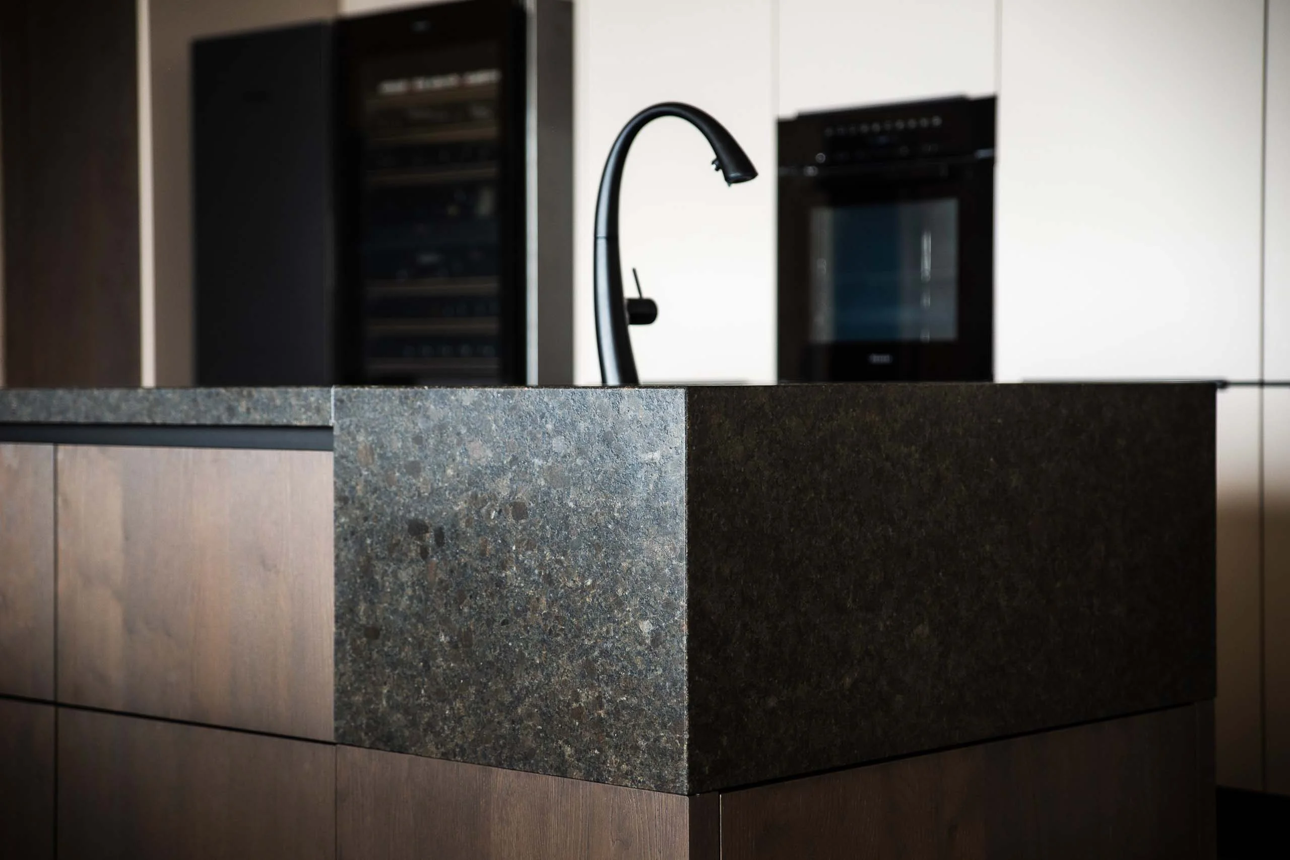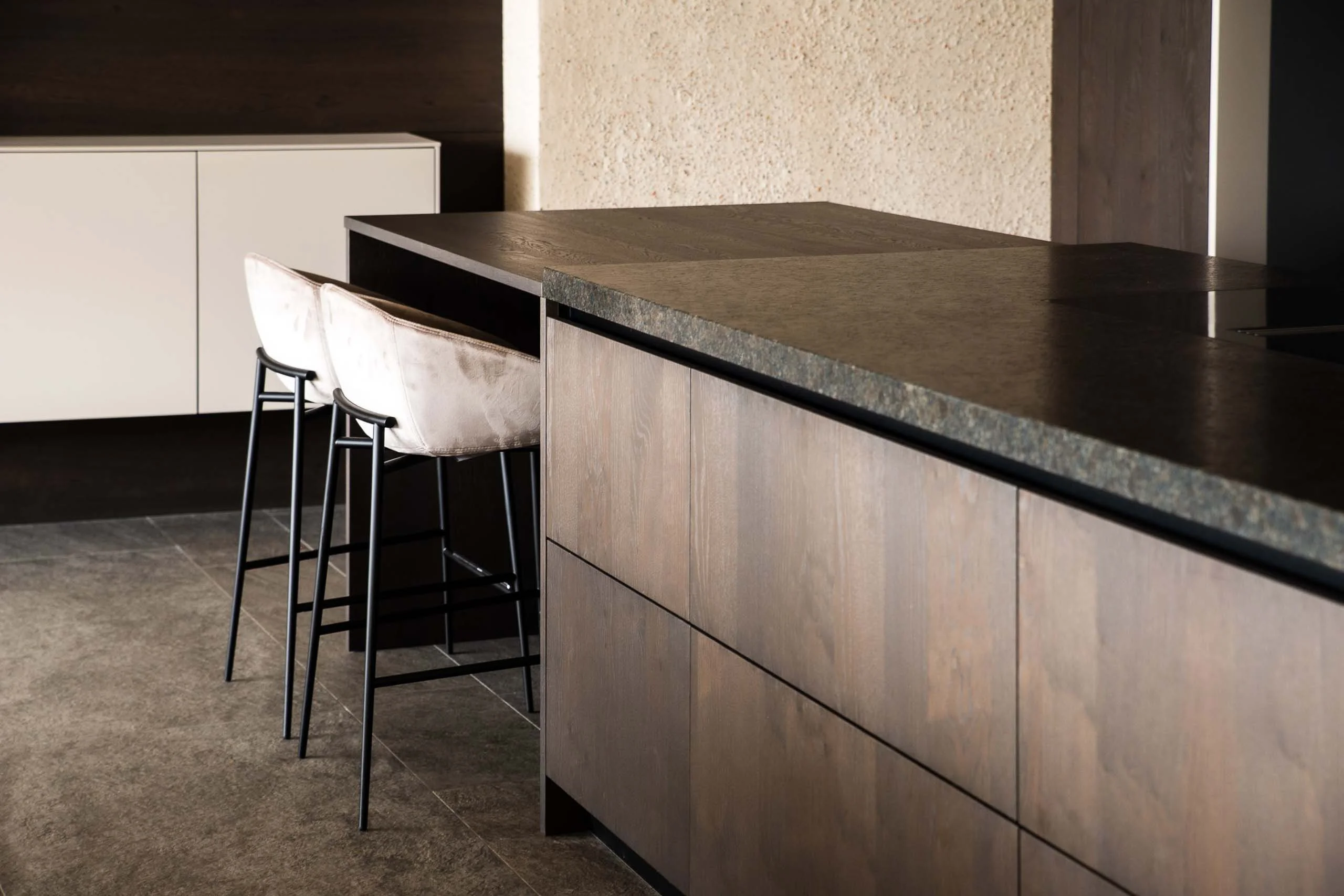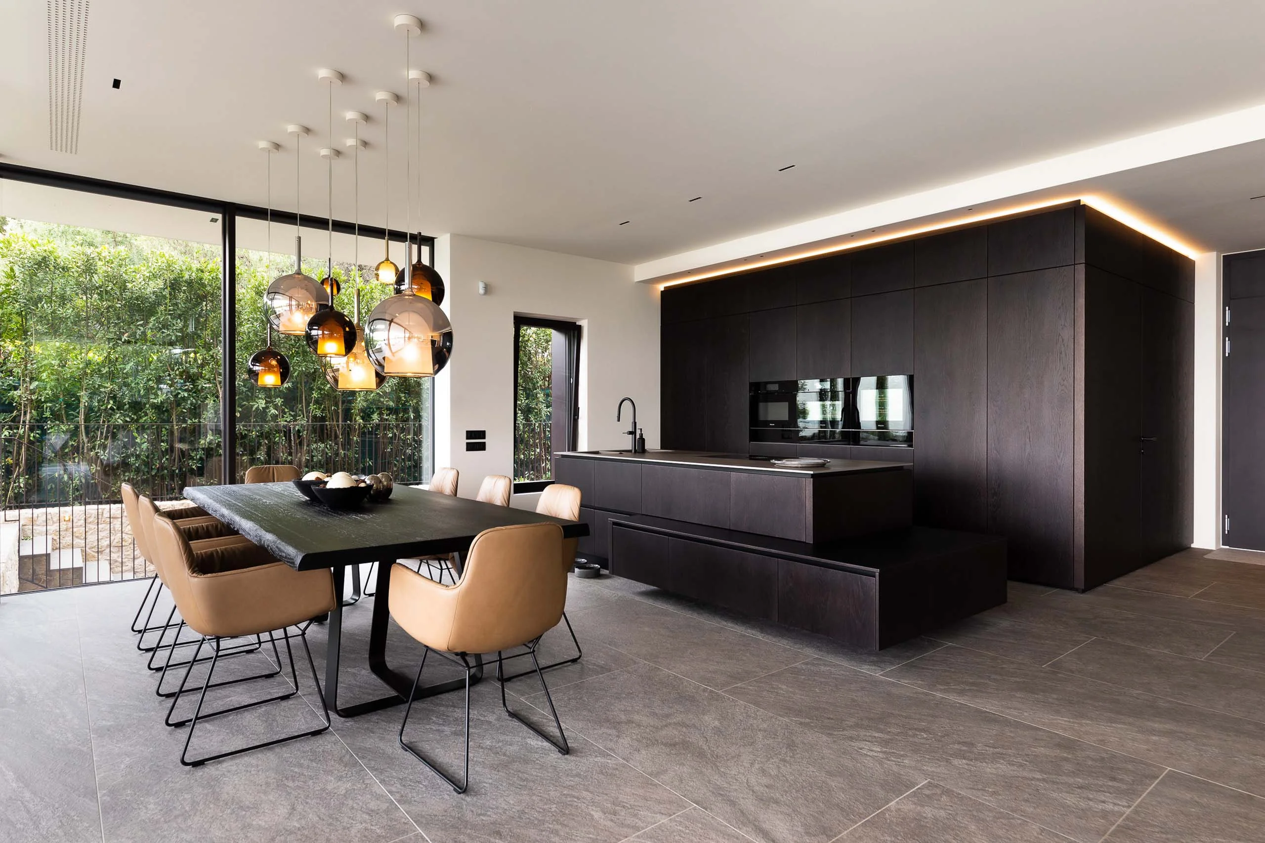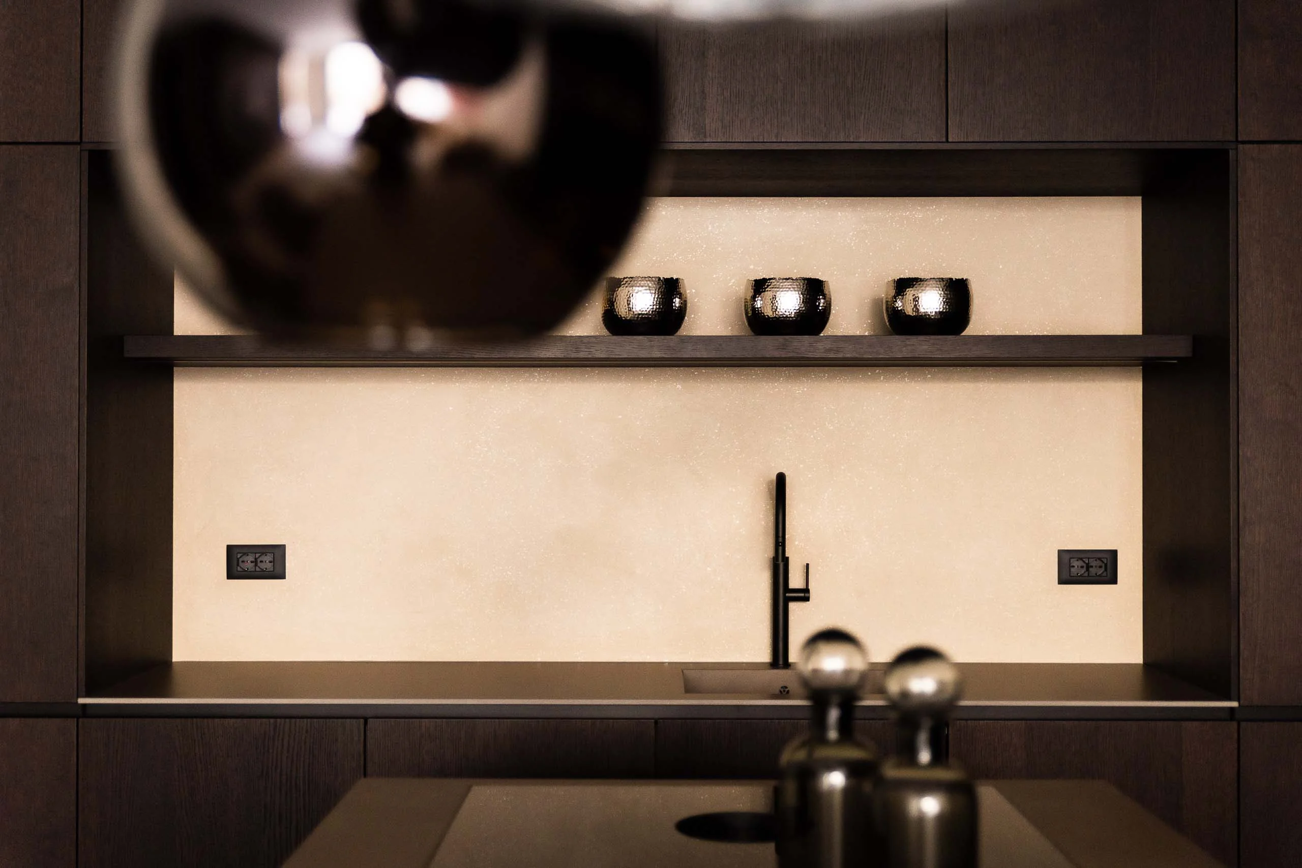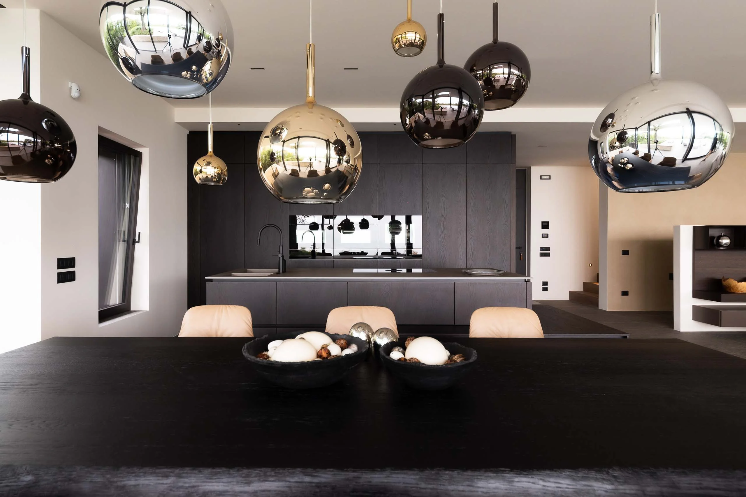 Küche, Wohnzimmer und Schlafzimmer – alles wie aus einem Guss. Die dunkle Eiche kombiniert mit den dezenten Cashmere-Tönen der Lackelemente verleiht dem Raum eine elegante Schlichtheit, die zum Entspannen einlädt. Die frischen Gelb-Akzente bringen Frische ins Zuhause und erinnern an die Zitronenbäume im Garten. Abgerundet wird das Ganze durch ein ausgeklügeltes Lichtkonzept mit dezenten Einbaustrahlern und Designerleuchten.