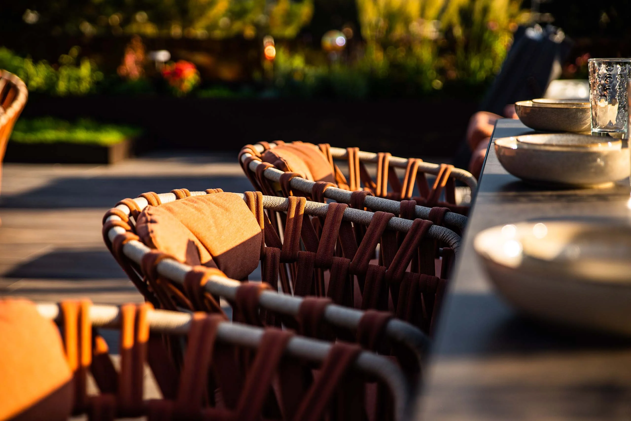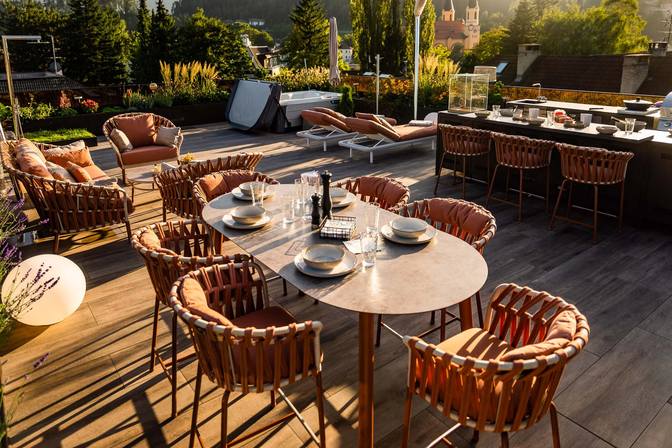 Hoch über den Dächern von Bruneck liegt diese spektakuläre Dachterrasse. Die eleganten, rostbraunen Gartenmöbel von Varaschin aus hochwertigem Seilgeflecht laden zum Entspannen ein. Das Highlight: die großzügige Outdoor-Küche. Hier wird Kochen zum Genuss – ein wahres Paradies für alle, die das Besondere lieben.